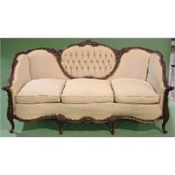 ORNATE VICTORIAN SOFA. Ornately carved. Feather-down cushions. Slight staining to upholstery. Wear to feet. 36” H, 73.5” W