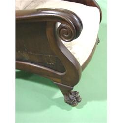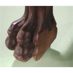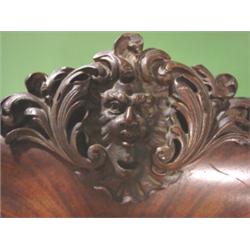 ORNATE VICTORIAN WALNUT ARM CHAIR. Ornately carved claw feet. Carved figural face on top of back. Scroll arms. Left claw foot is damaged. Veneer is missing on both sides. 46" H to top of back, 30" W