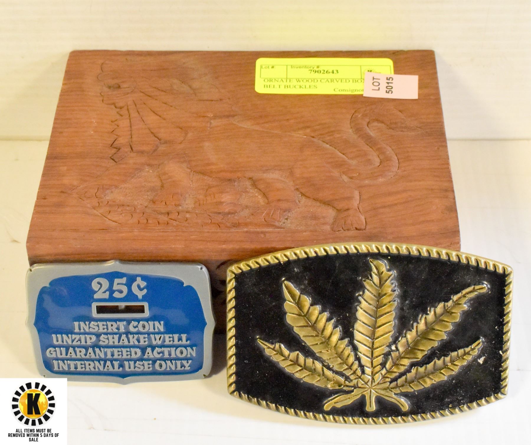 ORNATE WOOD CARVED BOX W/ 2 BELT BUCKLES