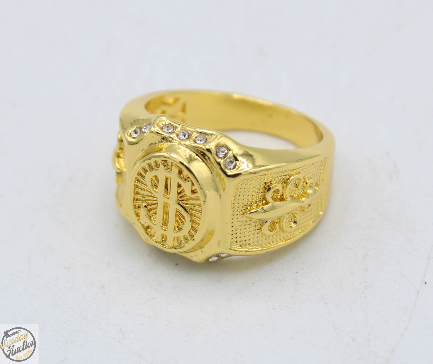 ORO LAMINADO MENS RING, GOLD TONE STYLE MONEY SIGN