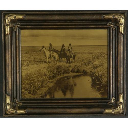 OROTONE(GOLDTONE) 7 5/8" x 9 5/8", Edward Curtis (1868-1952), WA. "Three Chiefs-Piegan". Signed lower right. Curtis studio label on the verso. Placed in a period frame. Intent on documenting "the vanishing race" of the Native American Indian, Curtis, already one of the most respected photographers of his time, took on the incredible feat of photographing all major tribes west of the Mississippi, an endeavor which took over 30 years and produced a 20-volume collection entitled "The North American Indian".