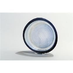 farbloses Glas, blauer Überfang, durch Krakatechnik entstandenes Netzmuster mit eingeschlossenen Luftbläschen. Über rundem Stand unregelmäßig runde Form. H.: 6 cm, Ø 21 cm. Bez.: ORREFORS KRAKA), Mod.Nr. 436, Künstlersign. SVEN PALMQUIST. 1960