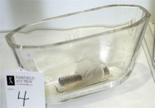ORREFORS VASE with etched semi-nude presentation on bottom 5" high, 11" diameter condition: good, but frog is glued & not removeable packing and shipping w/in continental USA (excluding insurance) $40
