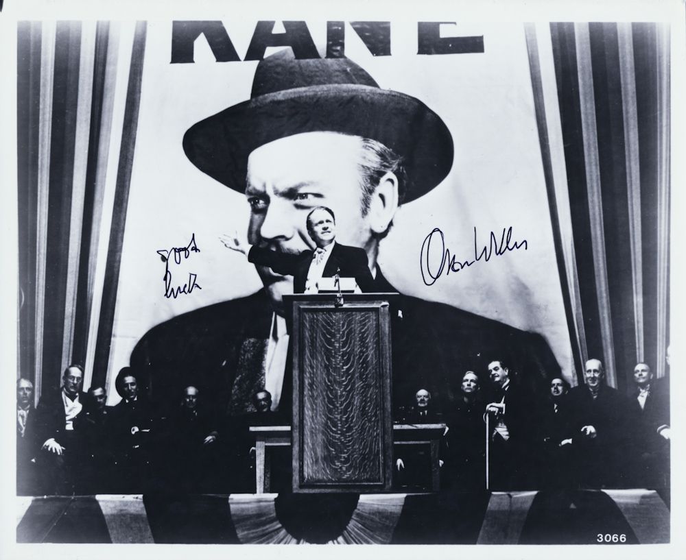 (1915-1989) American film actor, director and producer most remembered for his monumental "Citizen Kane" and his War of the Worlds radio broadcast. Fine S.P. 10" x 8" b/w, a still from his masterpiece "Citizen Kane", signed later in life adding: "Good luck". Fine.