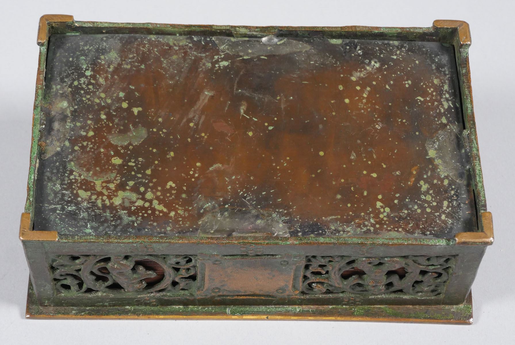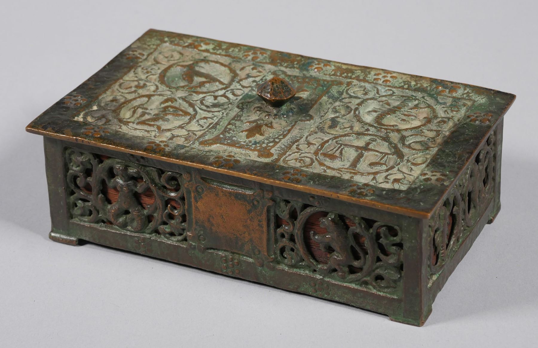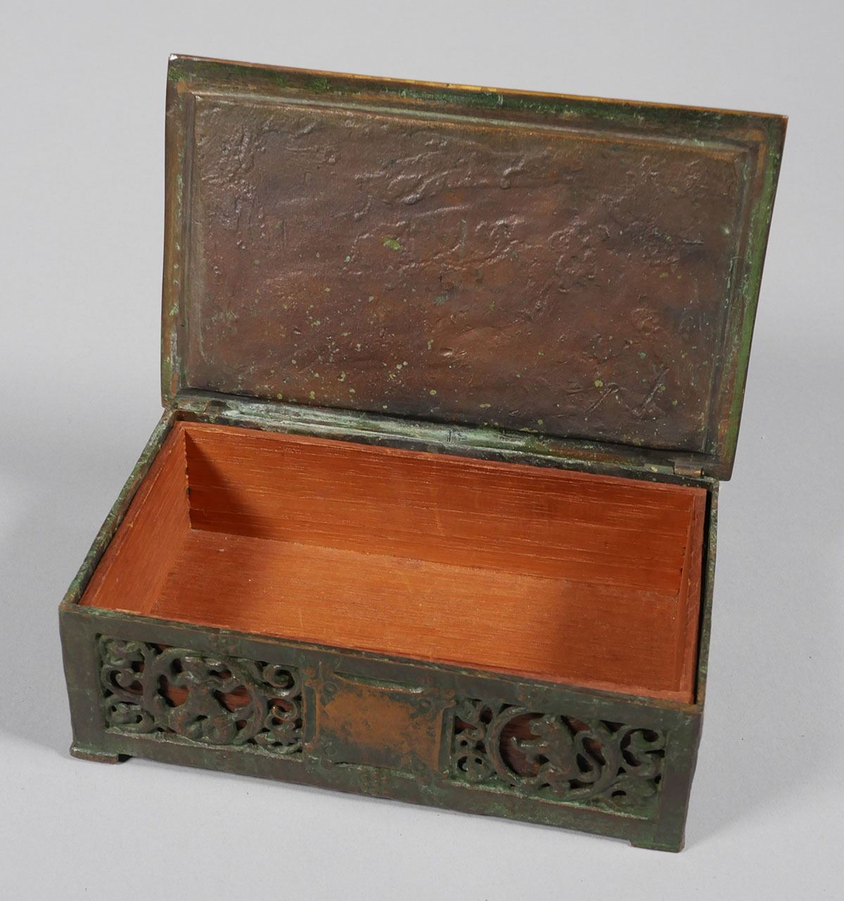 Oscar Bach designed bronze humidor box with patina and cedar wood inserts. Unsigned. Measures 2 1/4" x 7" x 4 1/4". Excellent condition, one hinge pin replaced.