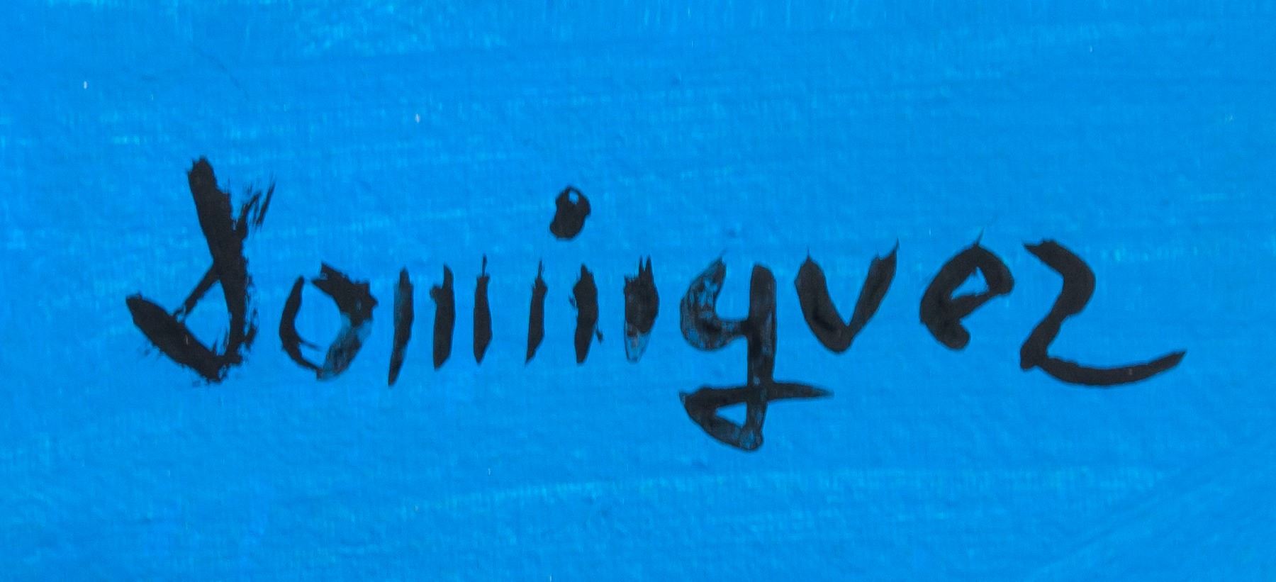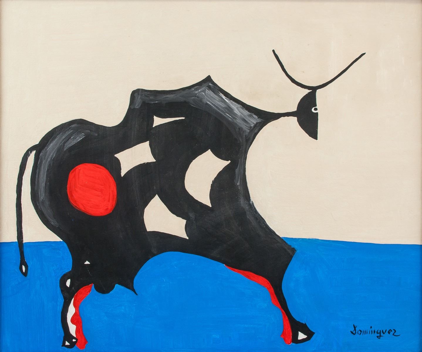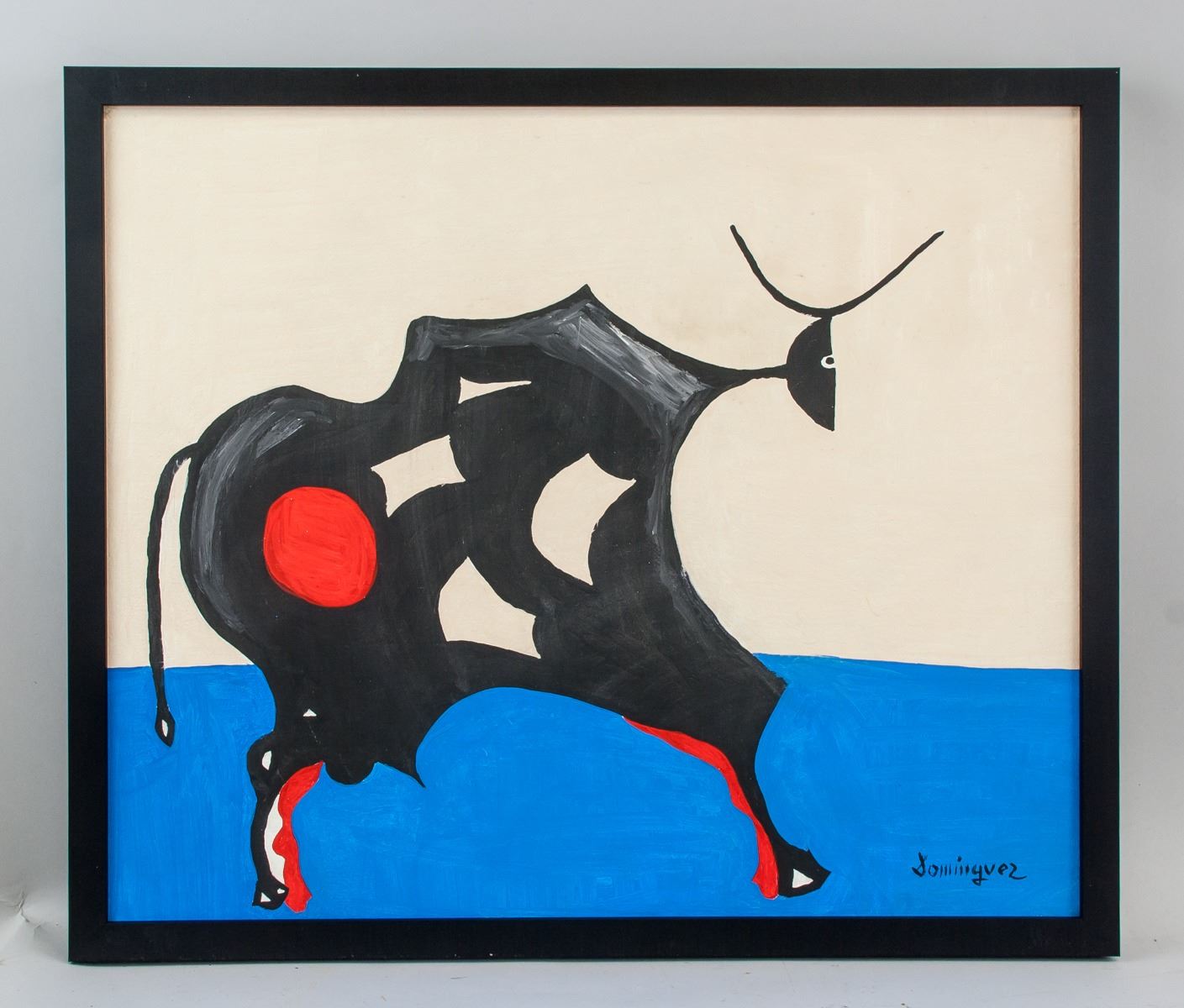 Oil on canvas, framed. Featuring a cubist portrait of a bull. Signed and attr. Oscar Dominguez (Spanish, 1906-1957), on the lower right corner. 52 x 43.5 cm (20.5 x 17.2 inches). Óscar Dominguez was a Spanish artist best known for his loosely rendered Surrealist paintings. Influenced by avant-garde European painters such as Rene Magritte, Giorgio de Chirico, and Yves Tanguy, he employed bizarre subject matter to great effect. Dominguez, like Max Ernst, used a technique called decalcomania. A transfer process developed for engravers around 1750, decalcomania shifts paint from thin sheets of glass onto canvas or paper.