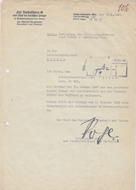 (1892 - 1951) Head of the Economic Office of the SS and ultimate overseer of the concentration camp system. It was Pohl who turned his victims' dental gold, eyeglasses, hair, etc. into cash for the SS, using the infamous "Max Heiliger" Swiss accounts. Captured and executed in 1951. War-date T.L.S., 1p. large 4to., Berlin, Jan. 29, 1942 to the SS Personnel Office advising that SS-Sturmbannfuhrer Paul Hubner had been in the full service of the SS since January 31, 1942, part of the time in reserve, and as of Feb. 1 would be serving as Deputy Commissioner in Karthaus. Small tear at top margin, else very good.