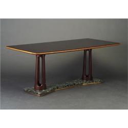 OSWALDO BORSANI-attributed dining table, c. 1938, with smoked mirror top, wood trestle and green marble base with brass trim. Unmarked. 31" x 78 1/2" x 37 1/2" $2,200 - 2,800