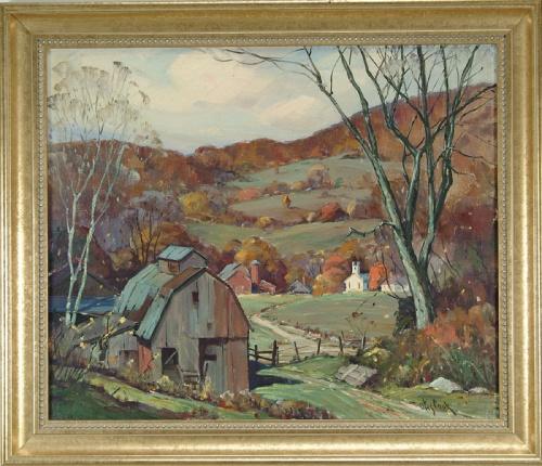 OTIS PIERCE COOK JR. (American, 1900-1980) "VERMONT-W. ARLINGTON". Fine oil on canvas fall landscape with hills, fields and village in a typical Vermont setting. Housed in a gilt molded wood frame. Signed lower right. SIZE: 20in. x 24in.. CONDITION: Very good. 9-26518