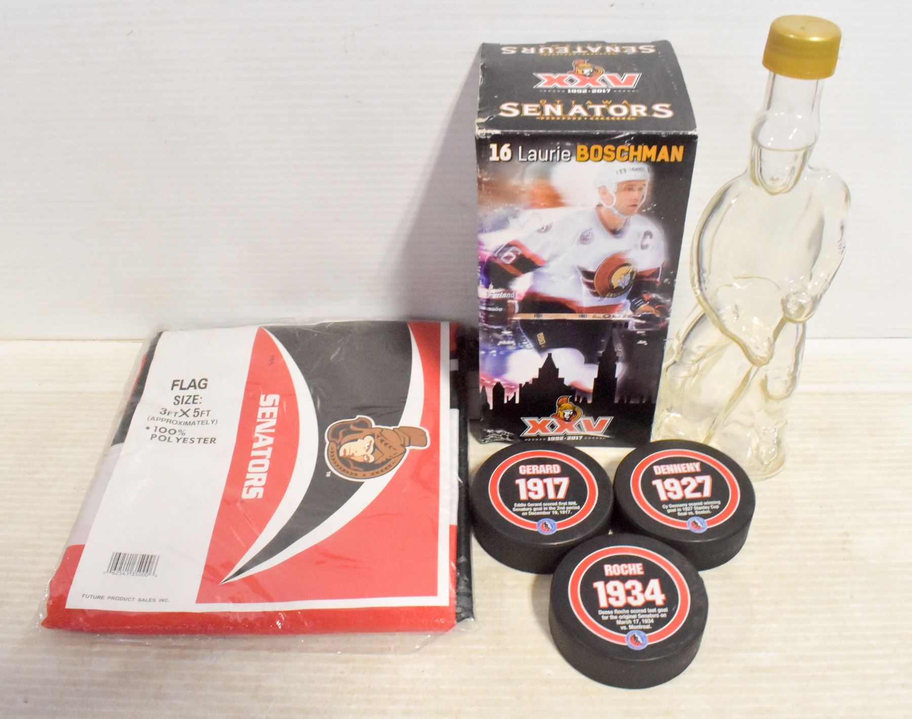 INCLUDES 1X BOBBLE HEAD, 3X PUCKS, 1X SENATORS FLAG, 1X HOCKEY PLAYER MAPLE SYRUP BOTTLE