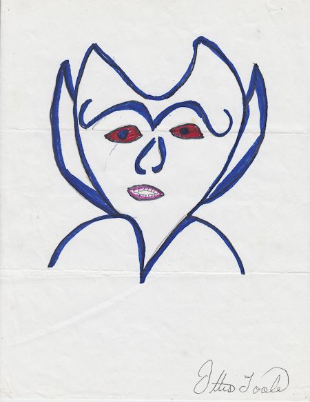 (1947 - 1996) American serial killer, arsonist and cannibal, an accomplice of convicted serial killer Henry Lee Lucas. Toole and Lucas admitted to hundreds of unsolved murders throughout the United States over several decades knowing details only the perpetrator would know. Original art, a 8 1/2" x 11" sheet of white paper dyed green with Toole's white handprint thereon, to which he has added in a spidery hand: "BEEN EVERYWHERE BUT THE ELECTRIC CHAIR. SEEN EVERYTHING BUT THE WIND. THE HAND OF DEATH IS THE CROSS I BEAR UNTIL THE VERY END". Signed in blue ink at bottom. Fine.