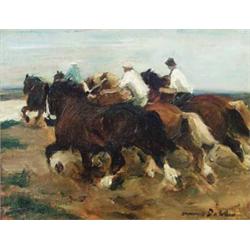 Zur Schwemme. Bauern hoch zu Roß mit Beipferden auf dem Weg zu einem Gewässer. Oel auf Leinwand. - <U>Signiert</U>. Größe: 35 x 45 cm. Doubliert. Otto Dill gilt als einer der maßgeblichen Künstler des deutschen Impressionismus. Unter seinen Tierdarstellungen treten neben den “Löwenbildern” besonders zahlreich Gemälde und Zeichnungen von Pferden hervor, die er sowohl in ihrer sportlichen Ausprägung als Rennpferde, beim Polospiel oder als elegantes Reitpferd zeigt, als auch als Arbeitstier im Gespann oder wie bei der vorliegenden Arbeit nach getaner Arbeit auf dem Weg zur Schwemme. Dill weist sich als exzellenter Kenner dieser Spezies aus, indem er gekonnt die typischen Bewegungen der Tierkörper als Symbol kraftvoller und doch anmutiger Stärke darstellt. Gerahmt.
