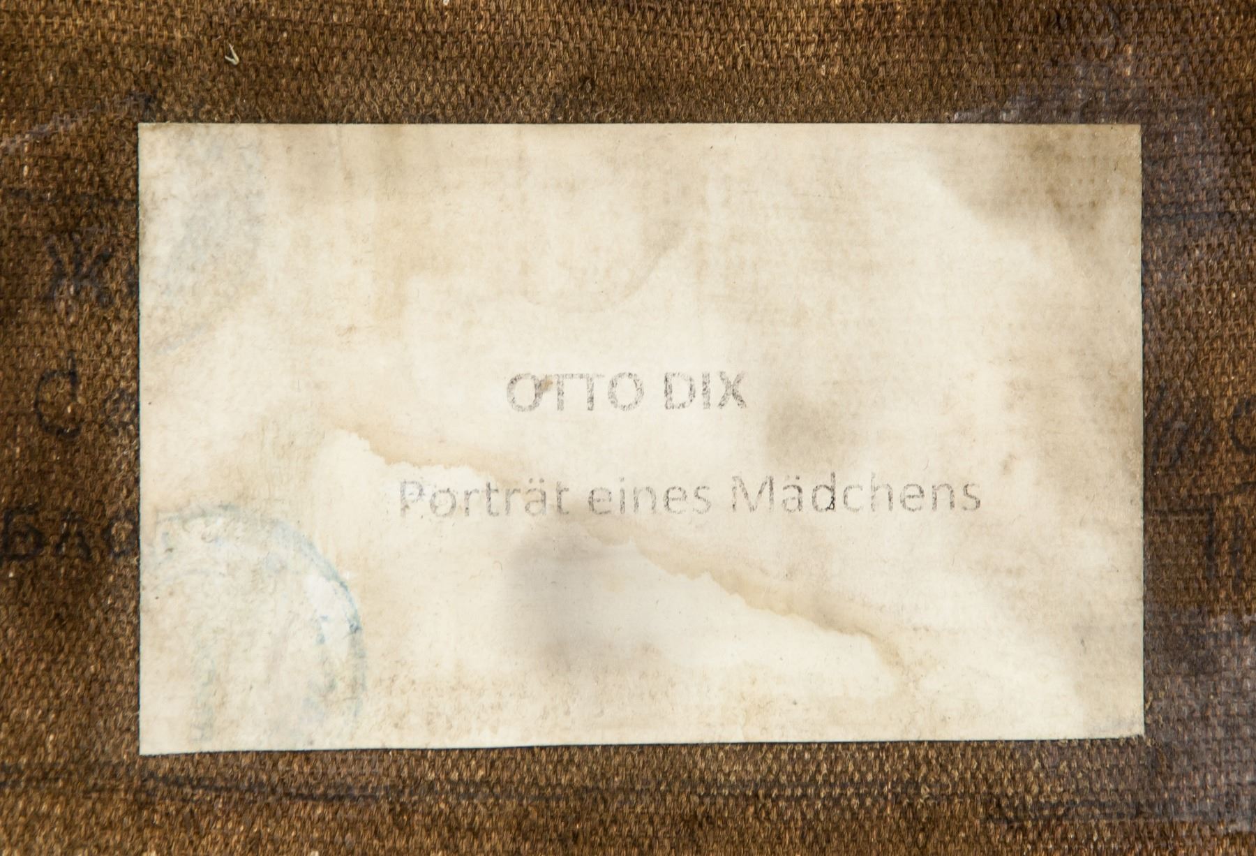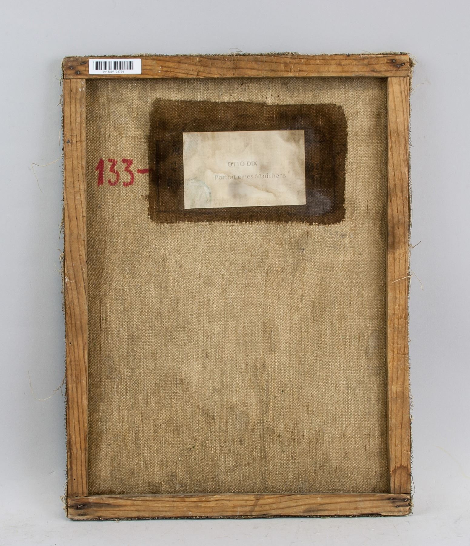 Oil on canvas. Signed and attr. with monogram of Otto Dix (German, 1891-1969) on lower right corner. With gallery inscription on verso and entitled, "Portrat eines Madchens", 15.7 x 11.8 in. (40 x 30 cm). In his Expressionist prints and paintings, Otto Dix immortalized the unprecedented horrors of World War I and its crippling aftereffects on life in Berlin. Anguish radiates from Dix’s desolate landscapes of military trenches filled with barely distinguishable, decaying human remains, the legacy of the first industrialized war, while images of poor, disfigured, and lonely veterans invisible to passersby on the streets were comments on war’s unequal impact on different societal groups. Exploitation is also the theme of his “Femme Fatale” paintings, criticizing the narcissism that drove women to work the system in attempt to outdo one another—a representation of the social turmoil at the time. Along with George Grosz, Dix is widely considered one of the most important artists of the Neue Sachlichkeit (“New Objectivity”), a term used to characterize the turn of public attitudes in Weimar Germany toward the practical and functional and the art the emerged from it.