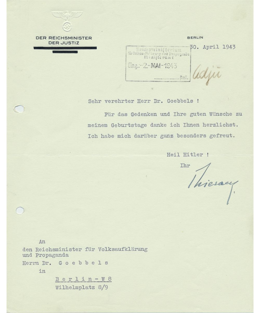 (1889 - 1946) Nazi Minister of Justice, made penal prosecution of all unpopular persons and groups harsher, with "antisocial" convicts turned over to the SS. This usually meant Jews, Poles, Russians, and Gypsies to be "annihilated through work". Committed suicide after his arrest. T.L.S. on official letterhead as Minister of Justice, 1p. 4to., Berlin, Apr. 30, 1943 to JOSEPH GOEBBELS expressing his thanks to Goebbels for having sent to him birthday wishes and mentioning how he had looked forward to the event. File holes at left, else fine.