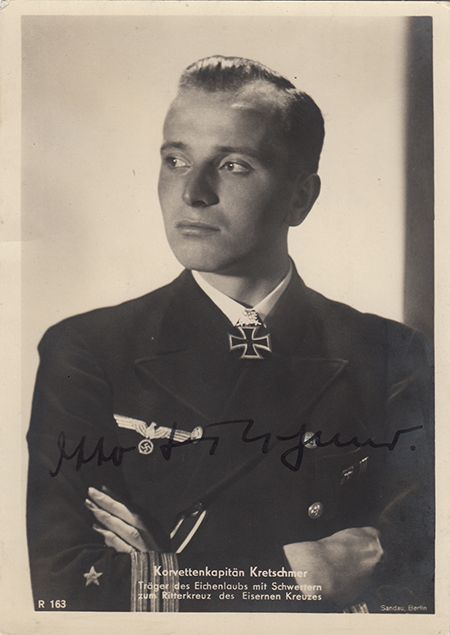 (1912 - 1998) U-boat ace, he became famous on his U-99 for his night-time surface attacks against convoys, and there his motto "One torpedo ... one ship" was created. Vintage S.P., possibly war-date, 4" x 6" b/w, a chest, up pose boldly signed across his chest. Fine.