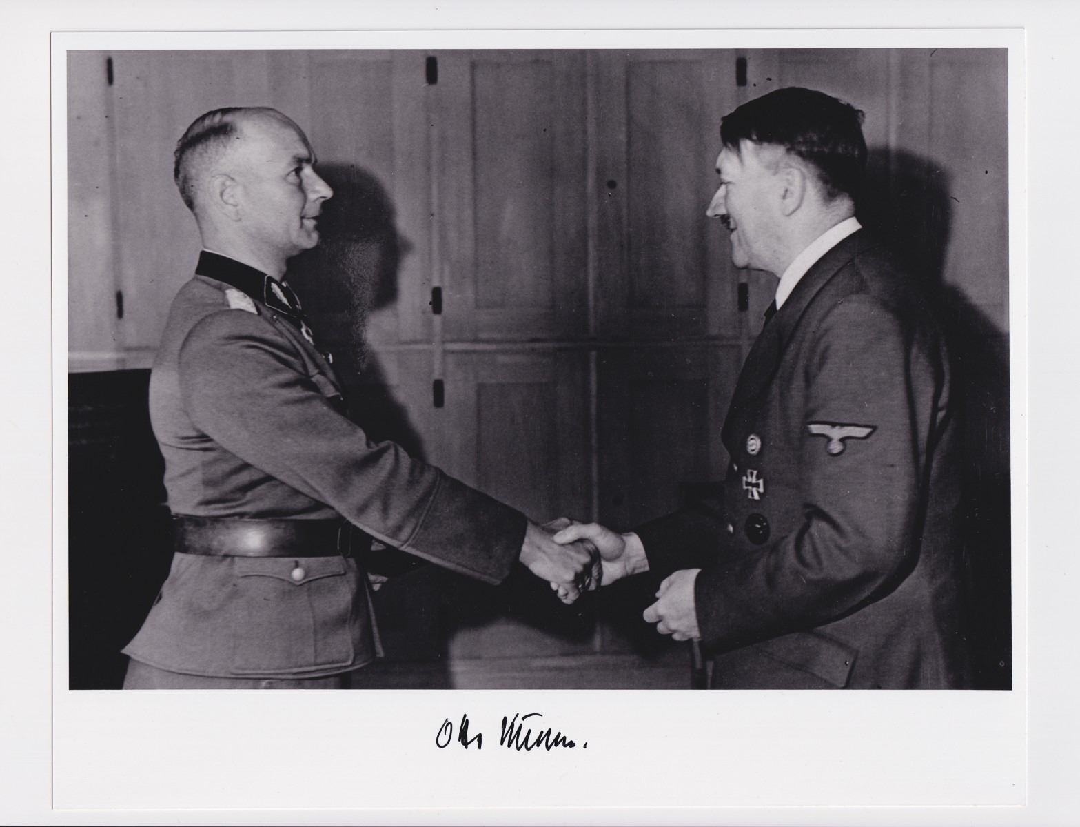 (1909-2004) SS-Brigadefuhrer and Generalmajor der Waffen-SS. Recipient of the Knight's Cross of the Iron Cross with Oak Leaves and Swords. Signed by Kumm in black ink in the white margin, 8 x 10 inches.
