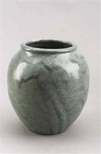 Vase,<BR> Keramik. Roter Scherben mit mehrtonig grüner Überlaufglasur. Über rundem Stand gebaucht, eingezogene Schulter, weite Mündung mit Wulst. H.: 16 cm. Bez.: Stempel der Werkstatt der sieben Faulen. 1930er Jahre<BR> Lit.: Klinge, E., Deutsche Keramik des 20. Jahrhunderts, Bd. I, Düsseldorf 1975, Abb. 541, S. 86 (Vgl.).<BR>