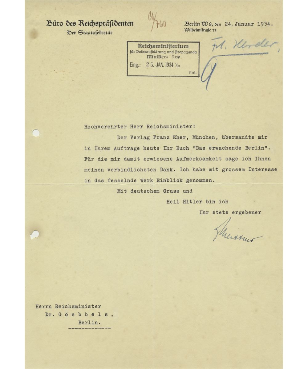 Fine association T.L.S. on his State Secretary letterhead, 1p. 4to., Berlin, Jan. 24, 1934 to Minister of Propaganda JOSEPH GOEBBELS sending his sincere thanks for having had sent to him Goebbels' propaganda book "The Awakened Berlin": "...I have read with great interest this captivating, insightful work...". File holes at left margin, dockets at top, else very good. The Awakened Berlin was written and published by Goebbels in 1934 to document the Nazi Party's struggle during the 1920's and early 1930's until finally coming to power. The book described all of the main players, including Hitler, Himmler, Goering, Goebbels, Hess, Frick, and Ernst Roehm...whom Hitler and Himmler would conspire to murder six months later.