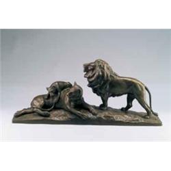 OTTO POERTZEL (1876 - 1963) Löwengruppe, Bronze, patiniert. Auf rechteckiger Plinthe mit felsartiger Bodenlandschaft eine Löwenfamilie, links die liegende Löwin, das Löwenkind auf ihrem Rücken spielend, rechts der wachende Löwenvater. 30,5 x 68,5 x 14,5 cm. Bez.: Künstlersign. Prof. Poertzel.1930er Jahre