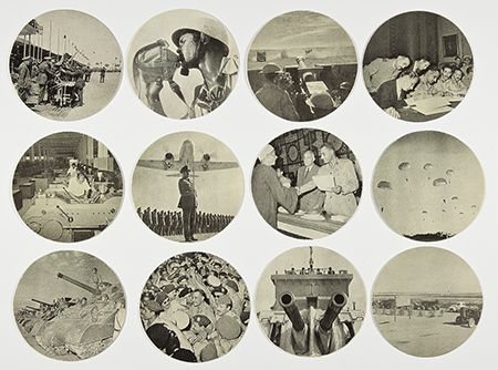 Collection of 12 2 1/2" dia. photos show Egyptian president Gamal Abdel Nasser, soldiers, tanks, paratroopers, artillery, etc. set into a circular white plastic presentation case bearing Nasser's bust, with a black holder, from the estate of Otto Skorzeny. Skorzeny supplied arms and ammunition to Egypt prior to the 1967 war, and actually held a Palestinian passport under a pseudonym. Very good.