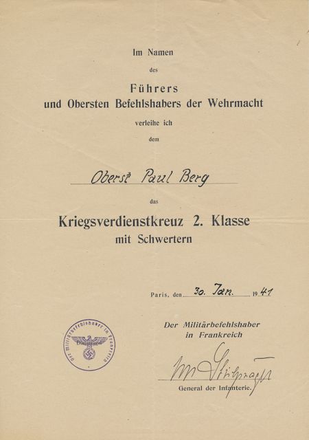 (1878 - 1948) German military commander of France during the Second World War. Despite his refusal to permit the looting of art, murder of hostages, and export of industry, he was condemned as a war criminal and committed suicide after a breakdown. Fanciful D.S., 1p. large 4to., Paris, Jan. 30, 1941, an award of the War Merit Cross 2nd Class with Swords to Oberst Paul Berg, nicely signed at bottom. Near fine.