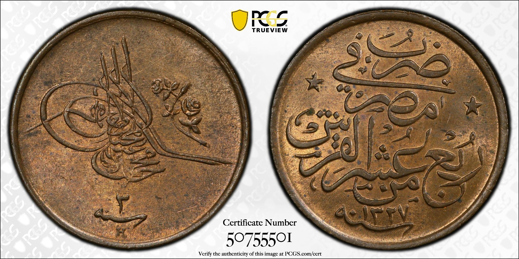 OTTOMAN: EGYPT: Mohammad V, 1909-1914, AE 1/40 qirsh, Misr, AH1327 year 3 (1911), PCGS MS64 RB
