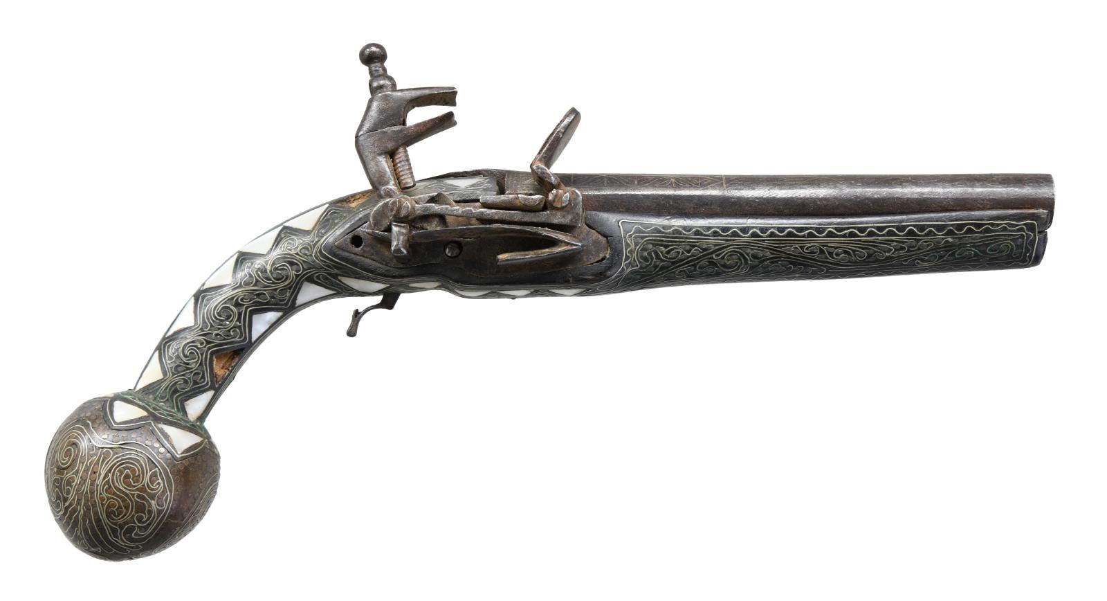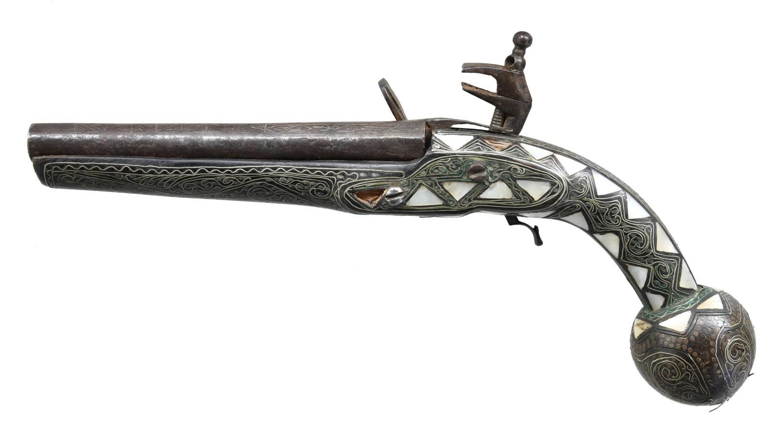 Cal. 54. S# NSN. Bbl 7". Unmarked lockplate with decorative wire inlaid stock, featuring triangular pearl panel inlays and a spherical butt. CONDITION: metal components a dark gray/brown patina overall, with areas of oxidation. Stock shows some cracks and losses to the pearl and wire inlays. Action is frozen. (01-23936/MLW). ANTIQUE. $200-400.