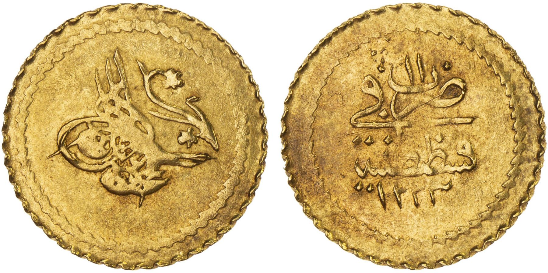 TURKEY: Mahmud II, 1808-1839, AV rubiye (0.80g), Kostantaniye, AH1223 year 11, KM-608, attractive and lustrous, Unc. The rubiye ("quarter") is 1/4 of the sultani (findik), which was struck to the standard of about 3.50g until reduced to 3.20g under Mustafa IV. Thus this rubiye is exactly 1/4 of the reduced sultani. It is not 1/4 of the zeri mahbub, which weighed about 2.60g, even though this classification has been almost universal in the KM and other catalogs. The rubiye may also be called 1/4 sultani, 1/4 findik, or 1/4 eshrefi (three more different terms for the same denomination).
