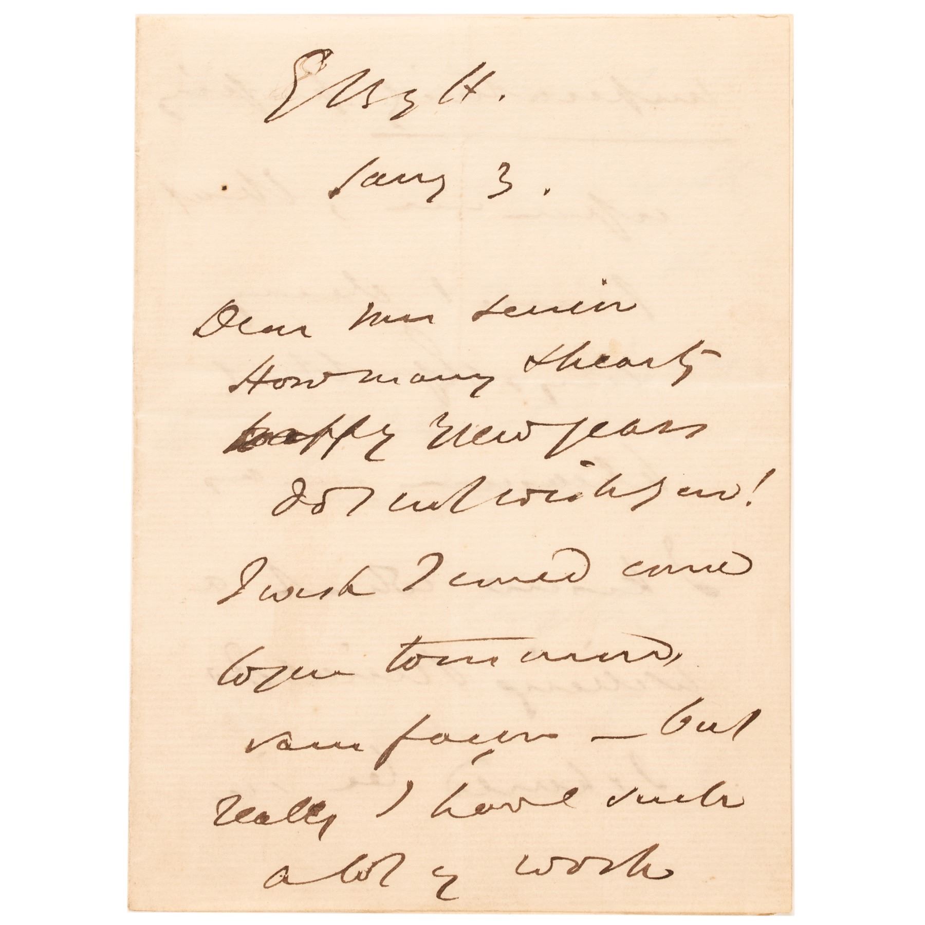 January 3, (no year), Scarce Autograph Letter Signed, 3 pages, measuring about 4.5" x 6", written to "Mrs. Senior", the wife of the notable British economist, Nassau William Senior, (1790-1864), Choice Very Fine. This Letter reads, in part: