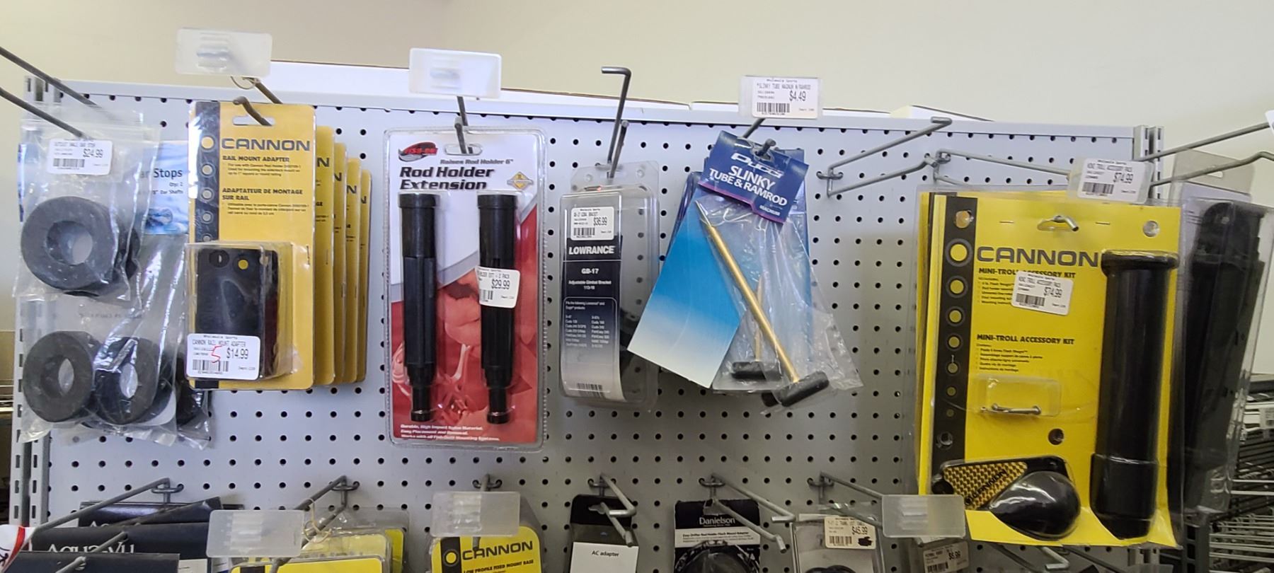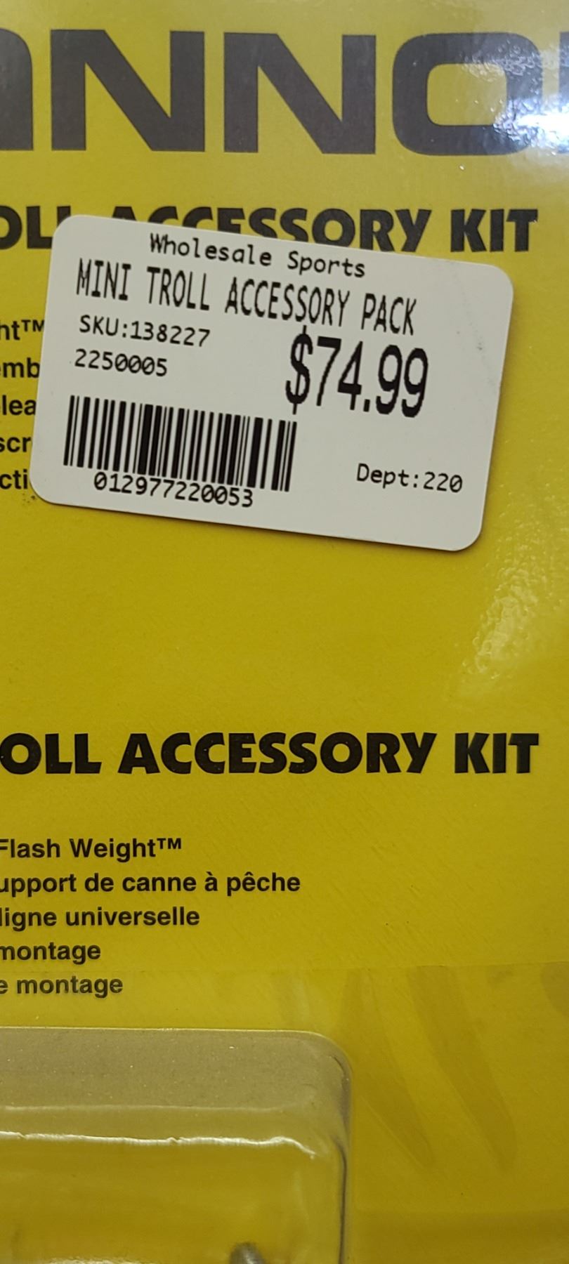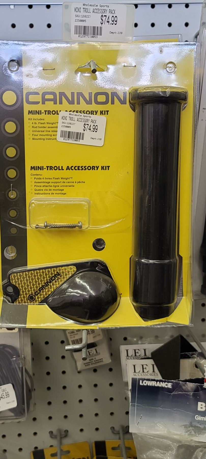 OUTCAST SMALL OAR STOP X6, CANNON RAIL MOUNT ADAPTER X5, FISH-ON 6" ROD EXTENSION HOLDER X4, LOWRANCE GB-17 ADJUSTABE GIMBAL BRACKET, PUCCI SLINKY TUBE AND RAMROD X14, CANNON MINI TROLL ACCESSORY KIT X2, CANNON SWIVEL POST EXTENSION X2 RETAIL VALUE $776