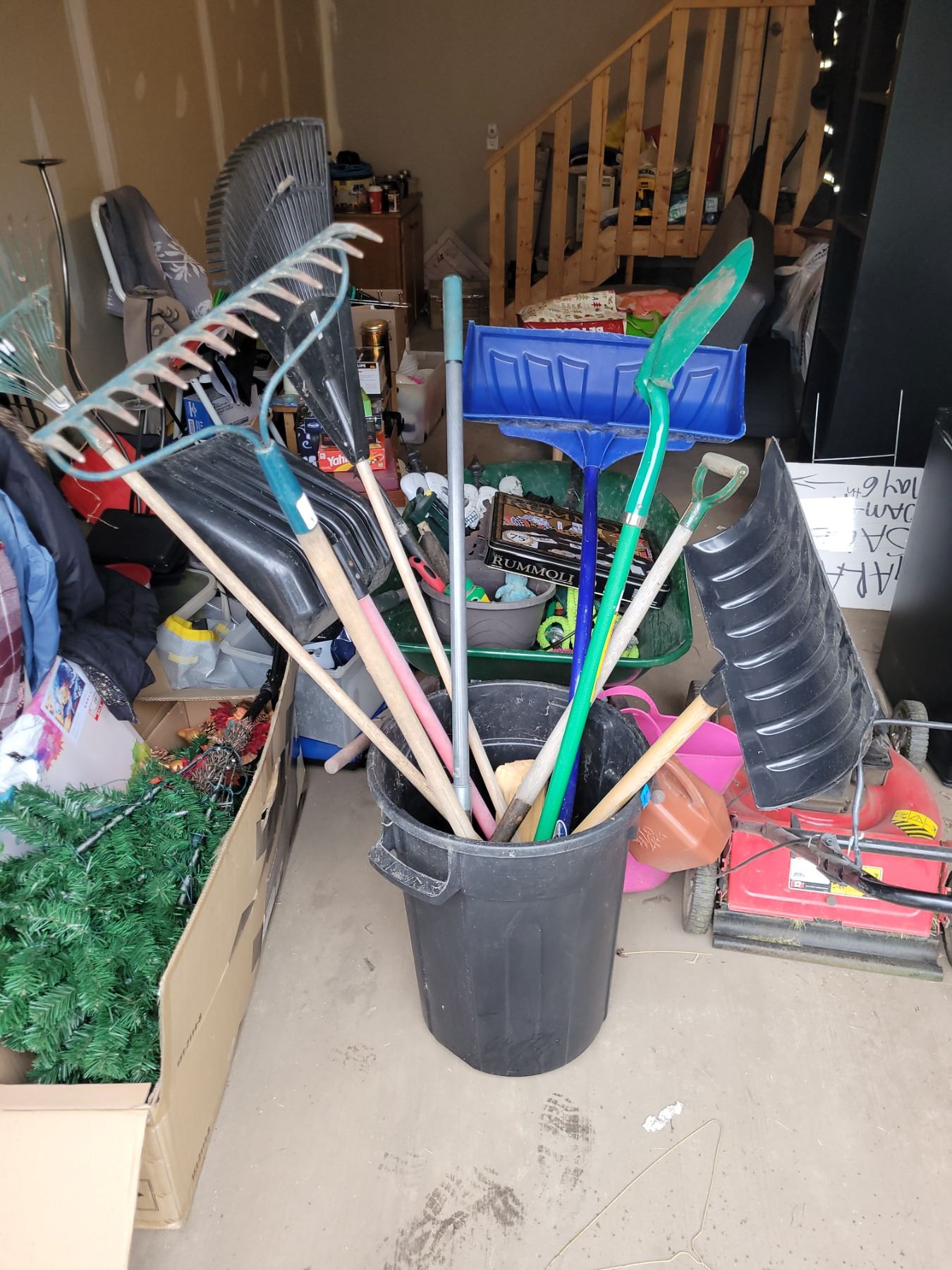 OUTDOOR GARBAGE CONTAINER WITH VARIOUS YARD TOOLS (COMES WITH BIN LID). AS IS WHERE IS. NO REFUND. NO RETURNS