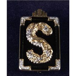 Lot 121 OUTSTANDING 14KT YELLOW GOLD AND DIAMOND PIN SIGNED ERTÉ 36 Rectangular frame with black background has an “S” made of a nude woman in yellow gold set with small diamonds.  The outside frame with gold corners set with five small diamonds each.  The side gold frame marked “Erté 36 © CFA 14k”. SIZE:  2-1/4” h x 1-1/2” w.  CONDITION:  Very good.  5-70823