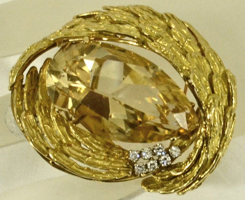 Can be worn as a brooch or a pendant. Definitely a statement piece.Pear Shaped Citrine measures 1.5" long x 1" wide. Brooch measures 2.25" long x 2" wide. Diamonds measure about 2.4mm in diameter. Total weight of brooch 40.4 dwt. Estimated retail value: $4000-$5000