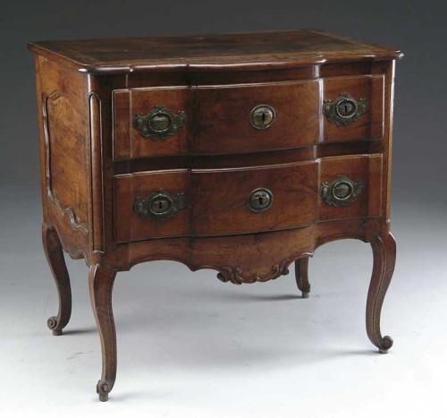 OUTSTANDING 18TH CENTURY ITALIAN COMMODE. Two serpentine front drawers are fitted with bronze ring pulls with stamped decorative backs having urns and figures. Carved skirt. Nicely shaped molded edge top, inset side shaped panels. All resting on four tall cabriole legs. SIZE: 35” h x 36” w x 23” d. CONDITION: Very good with a nice old patina. 9-28010