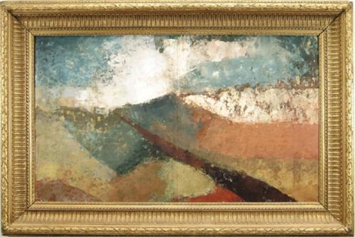 OUTSTANDING 19TH CENTURY GESSO DECORATED GILT FRAME. Deep frame with multiple designs, appropriate for any 19th C Hudson River landscape or equivalent painting. A modern abstract painting on paper is housed in frame which is unsigned. SIZE: Frameable is 26in. x 44in.. Overall is 36-1/2in. x 54-1/2in.. CONDITION: Very good. 9-26213