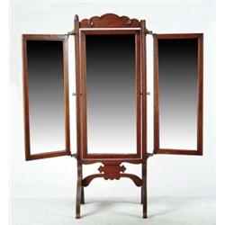 Lot # 1292 OUTSTANDING ADJUSTING THREE PART OAK CHEVALL MIRROR. Decal marked “Bele Heckey Mfg. Co. Store Outfitters St. Louis, MO”. The three part mirror has central section with tilting rectangular beveled edge mirror in a frame with carved crest, reeded stiles and acorn finials. All resting on a trestle type base with four legs. Side mirrors are beveled and rectangular in an oak frame with side adjustments for different angles. Original finish. SIZE: 79” h x 28” (closed); 73” (total open). CONDITION: Very good. One finial missing. 8-87264 (1,000-2,000)