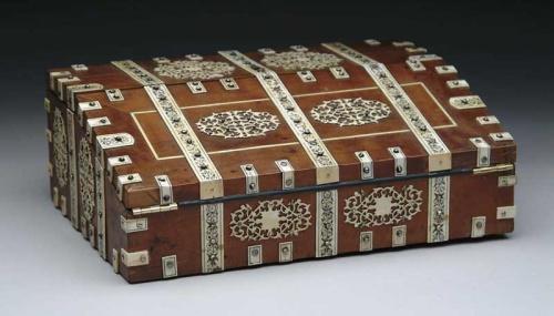 OUTSTANDING ANGLO INDIAN LAP DESK. Light wood case adorned with intricate carved and scrimshaw bone/ivory and embellished by silver tacks. Fold over lid has replaced leather writing surface and houses one compartment. Top hinged lid opens to reveal a fitted interior with two inkwells, pen tray and compartment. SIZE: 5” x 14” w x 10” d. CONDITION: Very good. 9-27094