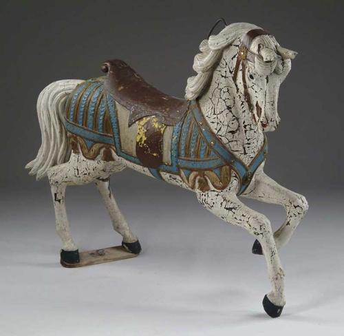 OUTSTANDING ANTIQUE CARVED AND PAINTED CAROUSEL HORSE ATTRIBUTED TO FREDERICK HEYN. The outside row horse has old paint surface in white with brown saddle having blue and gold dressing. Rhinestone decorated bridle and older paint layers beneath existing old paint. Large carved tail rests on right back leg. The right flowing mane is well carved, the head is down with horizontal carved ears. Front left leg is bent up with other down. Nicely carved saddle. Stands on its own, the back legs have a wood plate attached to bottom. SIZE: 43-1/2” h x 56” l. CONDITION: Generally very good with scrapes and chips to paint. 9-27582