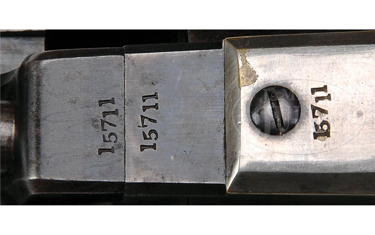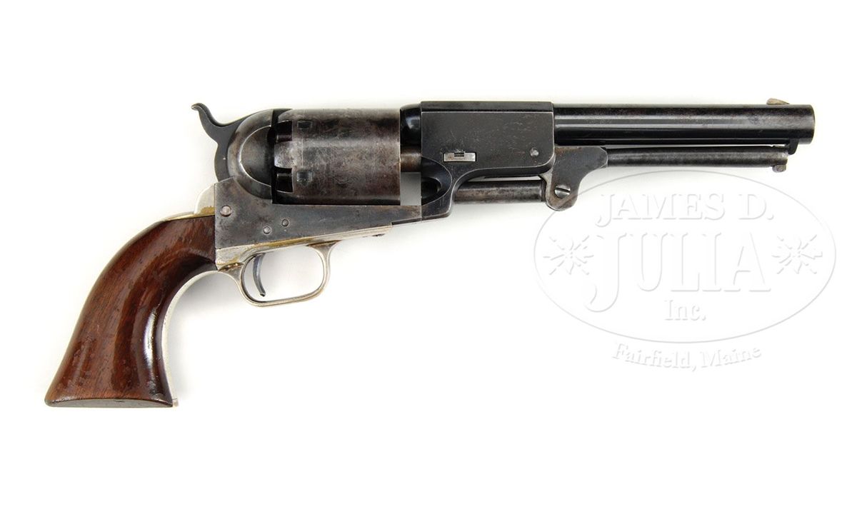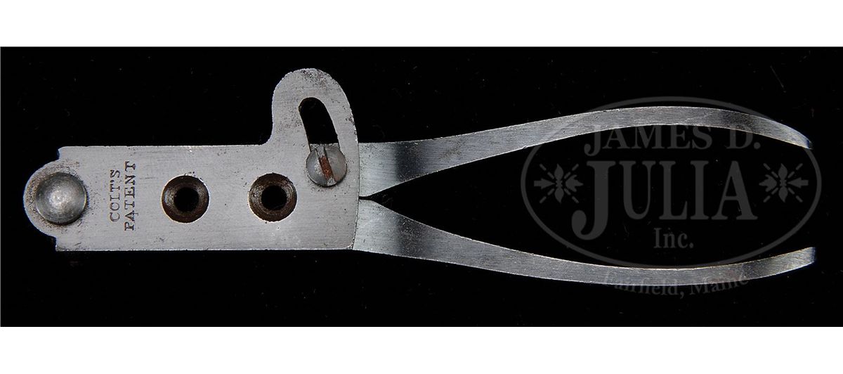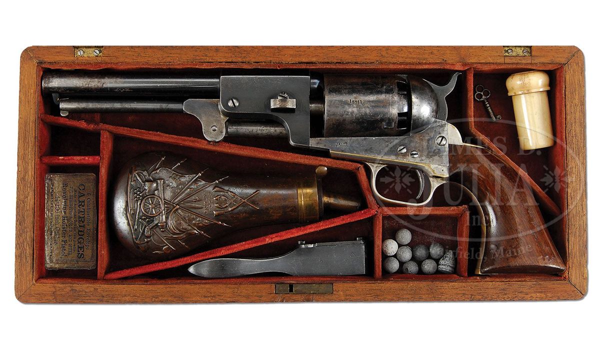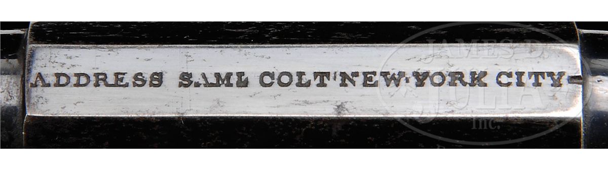 SN 15711. 44 Cal. This is a fine example of an apparently never fired 3rd Model Dragoon retaining most of its original finish in its original factory case with accessories also in excellent condition. This gun is in the usual configuration with 7-1/2" partially octagonal bbl, German silver blade front sight and single line New York address. Left side of frame stamped "Colts Patent". Cylinder scene is crisp and well defined showing the rolled "Texas Ranger/Indian Fight". The "Ormsby" signature is complete and easily read as can be seen in photos. Surrounding the serial number on cylinder are two ribbons reading "MODEL USMR" & "COLTS PATENT". This gun is all matching, complete and original in every regard, there are few better cased Dragoons than this one. PROVENANCE: Dr. John & Margaret Pickup Collection. CONDITION: This gun is very fine overall showing little wear. The bbl retains over 90% of its original bright blue finish with scattered scuffs and scratches especially in area at left muzzle about 2" x 1/2" where finish is worn, being plum and gray. Loading assembly is gray/silver overall with flats of lever being mostly muted case color. Wedge retains most of its color on flats. Frame retains 70-80% muted case colors with balance silver/gray with staining especially on shoulders. Cylinder retains 95%+ of the rolled Indian Fight cylinder scene with 20-30% blue retained. Balance of cylinder is silver/gray with much original blue inside chambers. Two safety pins are still fairly crisp and intact, the other four are partially or totally flat. Back of cylinder which retains strong traces of bright finish around safety pins and a crisp inspector "R". Stocks are sound and solid with about 70% of their original varnish. Backstrap and trigger guard retain over 90% of their original silver plate. All markings including bbl address and serial numbers are all crisp and legible. Accompanying 6-3/4" Colt marked flask with angled spout retains 60-70% of its original brown lacquer and is otherwise complete and functional. Accompanying 44 caliber two-cavity bullet mold has "S" stamped on one side and sprue cutter is marked "Colts Patent". Body of mold retains over 90% of its original blue finish with scattered nicks and scratches. Sprue cutter retains most of its finish, though thinning and turning plum. Included is a packet of cartridges. Case lining has scattered wear and fraying as expected. Fits gun, mold and flask very well. Top of case has crack running its entire length, but overall case is sound and solid with the normal scrapes and scratches. Case still retains an original contemporary key that operates lock. The Dixon marked oiler in case is in excellent condition as is the carved bone container with screw top. 4-48769 JS138