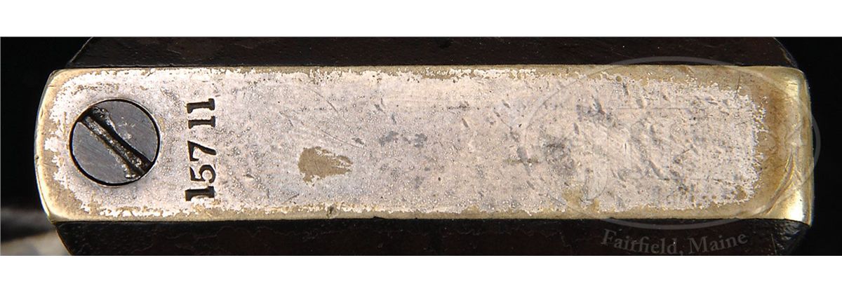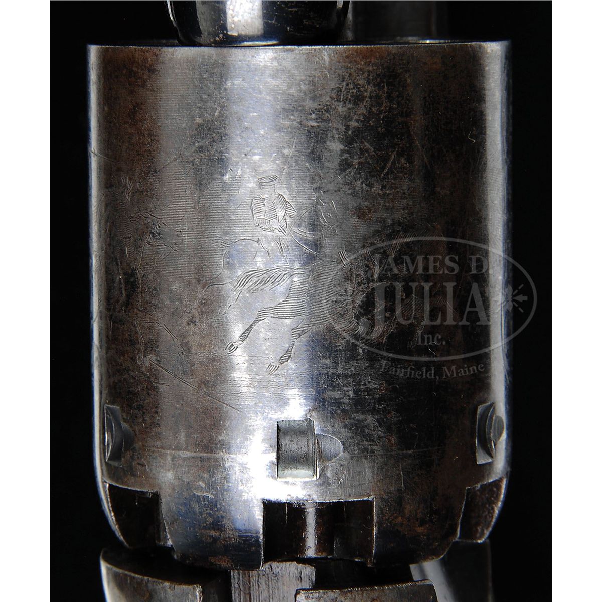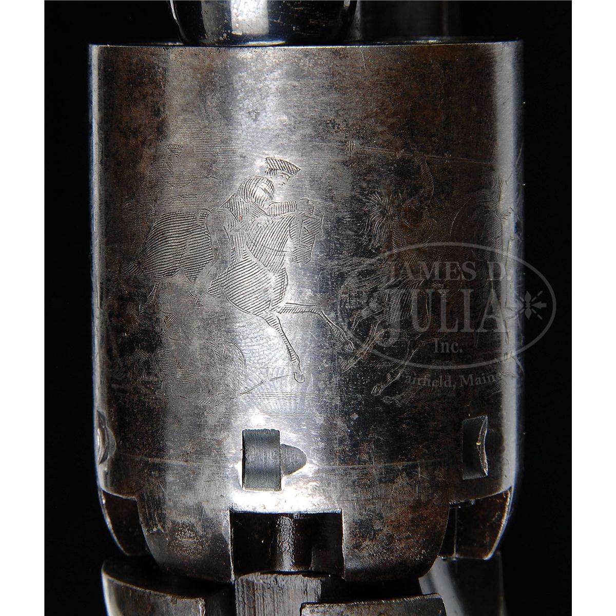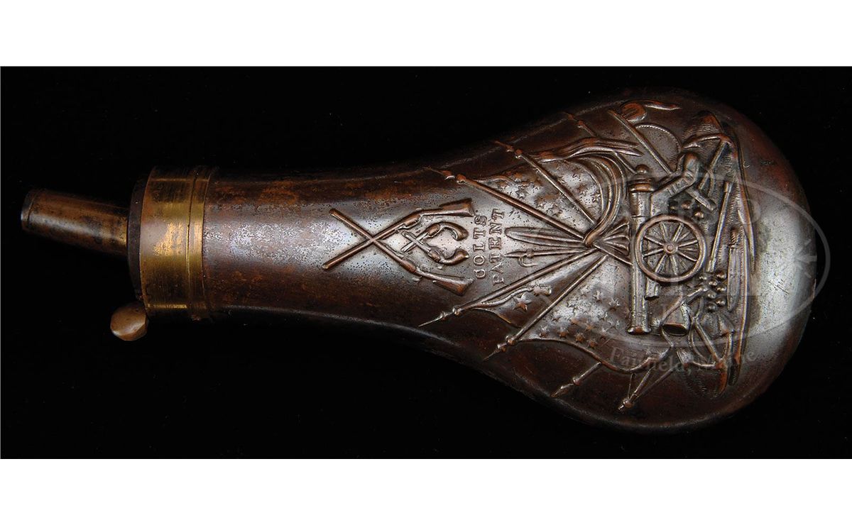SN 15711. 44 Cal. This is a fine example of an apparently never fired 3rd Model Dragoon retaining most of its original finish in its original factory case with accessories also in excellent condition. This gun is in the usual configuration with 7-1/2" partially octagonal bbl, German silver blade front sight and single line New York address. Left side of frame stamped "Colts Patent". Cylinder scene is crisp and well defined showing the rolled "Texas Ranger/Indian Fight". The "Ormsby" signature is complete and easily read as can be seen in photos. Surrounding the serial number on cylinder are two ribbons reading "MODEL USMR" & "COLTS PATENT". This gun is all matching, complete and original in every regard, there are few better cased Dragoons than this one. PROVENANCE: Dr. John & Margaret Pickup Collection. CONDITION: This gun is very fine overall showing little wear. The bbl retains over 90% of its original bright blue finish with scattered scuffs and scratches especially in area at left muzzle about 2" x 1/2" where finish is worn, being plum and gray. Loading assembly is gray/silver overall with flats of lever being mostly muted case color. Wedge retains most of its color on flats. Frame retains 70-80% muted case colors with balance silver/gray with staining especially on shoulders. Cylinder retains 95%+ of the rolled Indian Fight cylinder scene with 20-30% blue retained. Balance of cylinder is silver/gray with much original blue inside chambers. Two safety pins are still fairly crisp and intact, the other four are partially or totally flat. Back of cylinder which retains strong traces of bright finish around safety pins and a crisp inspector "R". Stocks are sound and solid with about 70% of their original varnish. Backstrap and trigger guard retain over 90% of their original silver plate. All markings including bbl address and serial numbers are all crisp and legible. Accompanying 6-3/4" Colt marked flask with angled spout retains 60-70% of its original brown lacquer and is otherwise complete and functional. Accompanying 44 caliber two-cavity bullet mold has "S" stamped on one side and sprue cutter is marked "Colts Patent". Body of mold retains over 90% of its original blue finish with scattered nicks and scratches. Sprue cutter retains most of its finish, though thinning and turning plum. Included is a packet of cartridges. Case lining has scattered wear and fraying as expected. Fits gun, mold and flask very well. Top of case has crack running its entire length, but overall case is sound and solid with the normal scrapes and scratches. Case still retains an original contemporary key that operates lock. The Dixon marked oiler in case is in excellent condition as is the carved bone container with screw top. 4-48769 JS138