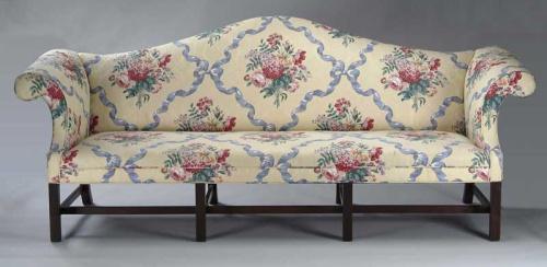 OUTSTANDING CENTENNIAL CHIPPENDALE STYLE CAMEL BACK SOFA. The mahogany frame has eight legs supported by a series of stretchers. The four front square legs have stop fluting and the back legs are outstretching. A finely formed rolled arm and high camel back. Nicely reupholstered in a spray of colorful flowers and blue ribbon on an ivory background. Extra upholstery material accompanies sofa. PROVENANCE: From a fine Portland, Maine home. SIZE: 39-1/2” h x 32” d x 17” seat h x 96” w. CONDITION: Very good to excellent. 9-27384