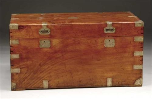 OUTSTANDING CHINA TRADE CAMPHORWOOD CAPTAIN’S TRUNK. Brassbound trunk with original brass end lifts. Mid 19th Century. SIZE: 21-3/4” h x 42-1/2” w x 22” d. CONDITION: Very good. 9-26639