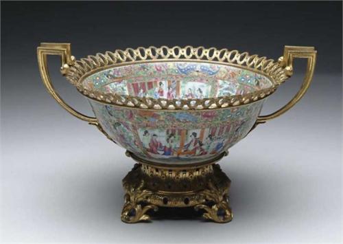 OUTSTANDING CHINESE EXPORT FAMILE ROSE PUNCHBOWL ON STAND. Mandarin bowl fitted into an original French fire gilt bronze base and mounts. Large handles with a laced bronze border. SIZE: 10” h x 18-3/4” w. CONDITION: Very good. 9-27925