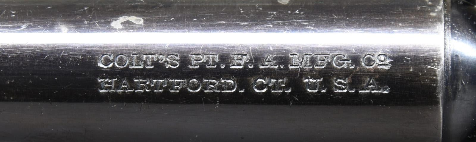 Cal. 38 CF. S# 300216. Bbl. 3 1/2" round of solid type w/o ejector. Bbl. has a brass cone type sight w/ Hartford address. Five shot round rebated conversion cyl. w/ stagecoach scene roll engraving. Bbl., cyl. & grip straps are blued. Frame, hammer & conversion ring have case colored finish. 1 piece walnut grips. Bbl., frame, grip straps & cyl. have matching numbers. Wedge has non-matching number "16512". CONDITION: high condition revolver retaining over 85% lightly faded blue & case colored finish. Original grip finish shows numerous scratches, marks & small dents. Sound action. Bore retains sharp rifling showing some light corrosion in grooves. (01-25160/DS). ANTIQUE. $2,500-3,500.