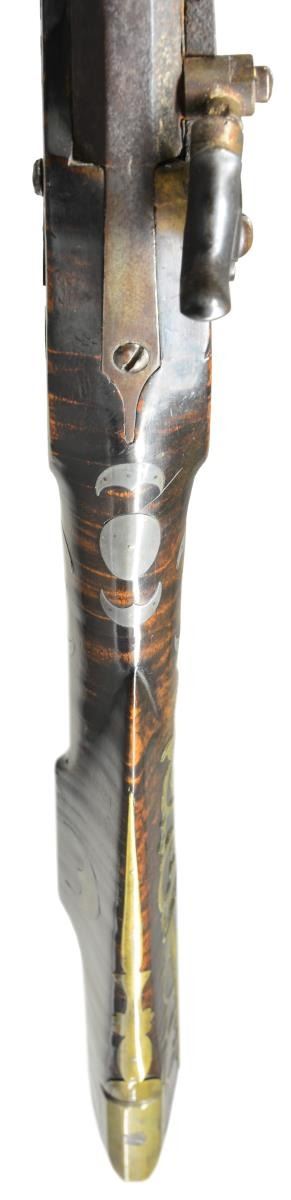Cal. 36 rifled bore. NSN. Bbl. 40" full oct. initialed “CB” on the top flat of the bbl. w/ 6" spiral weave & teardrop engraved patterns around fixed rear sight. Overall length 54 1/2". Charles Baum was producing percussion Kentucky rifles in the New Berlin area from 1832-1846. This very rifle is pictured on plate #79, pg. 87 of Edith G. Cooper’s book “The Kentucky Rifle and Me” when it was still in the T.J. Cooper collection. This rifle has a brass 4 piece patchbox w/ incredible 13 piercings, 6" elegant sculptured tapering brass comb plate, 7" brass toeplate w/ 4 piercings, 5 1/2" brass saddle plate which separates in the middle so the forend may be removed for cleaning & 38 silver inlays. Engraved percussion lock was made by Joseph Golcher, PA & has dbl. set triggers. Dark stained stock is curly maple & is nicely incised carved to rear of the cheekpiece. This is a rare takedown type Kentucky rifle, where the entire forend can be easily removed for cleaning the bbl. Charles Baum is one of the Baum family of gunsmiths & he produced percussion as well as flint rifles. His guns are often highly inlaid. Charles is the only Baum assessed in New Berlin as a gunsmith after the 1830s. CONDITION: outstanding original condition, the only flaw being a sm. 1/2" piece of wood missing along the bbl. above lock, a problem area on many Kentucky rifles. Mechanically functional, sharp rifled bore. PROVENANCE: Collection of Dr. John Persing. (01-19527/RG). ANTIQUE. $8,000-15,000.