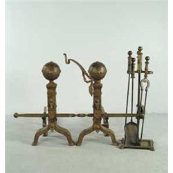 Lot 1213 OUTSTANDING FIREPLACE SET. Large ball top Mission style andirons have swinging built in crane and front tool holder. Unsigned, possibly by Bradley & Hubbard. Set of four tools in tool rack with similar design signed Bradley & Hubbard. SIZE: Andirons are 26-1/2” h. CONDITION: Very good. 9-96448 (500-1,000)