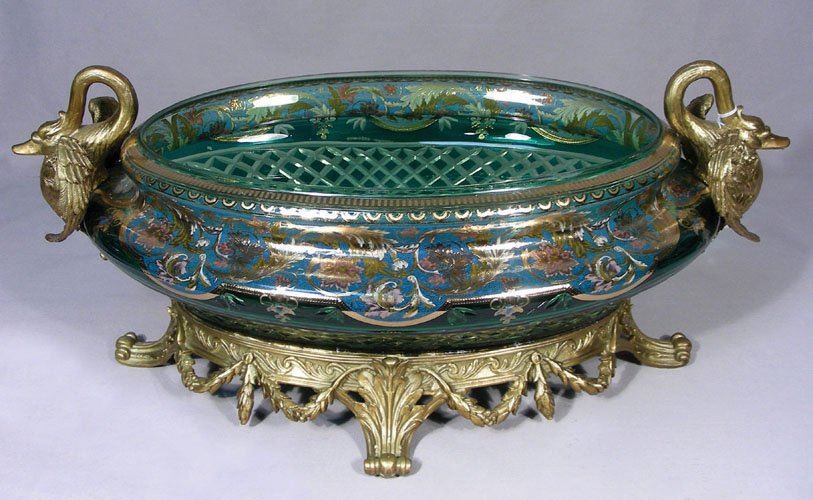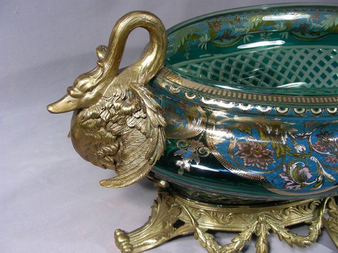 An ornate heavy bronze four footed base supports an oval emerald overlay crystal bowl with hand painted floral decorations. Bowl completed with two bronze swan motif handles. 10 1/2" high, 23" wide, 13" deep.