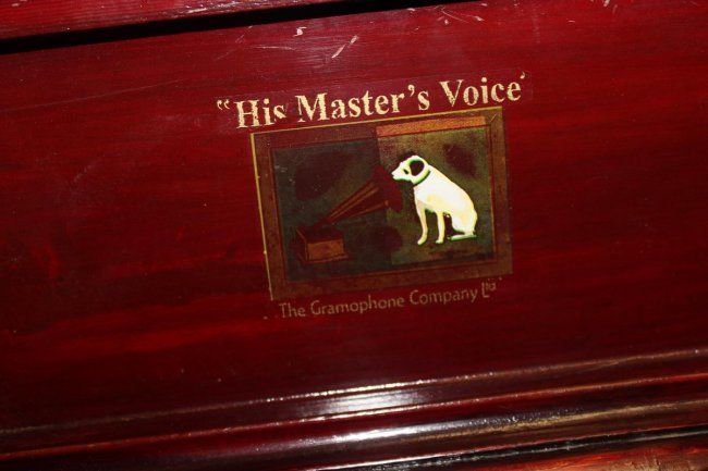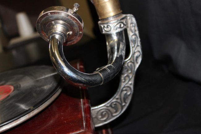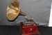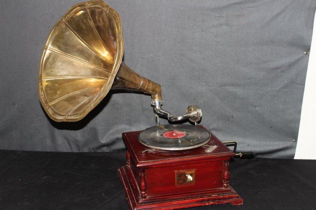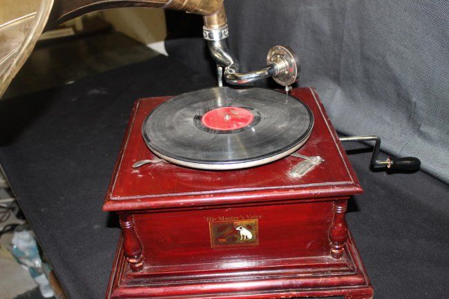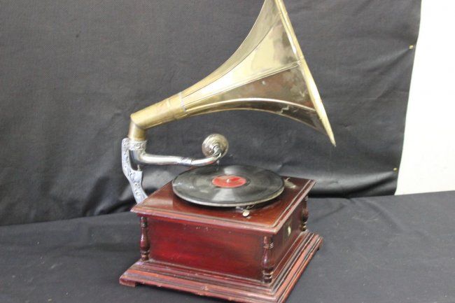 OUTSTANDING GRAMOPHONE MOVABLE BRASS HORN AND ORNATE NICKEL ARM. MAHOGANY - WORKS LIKE NEW - 14" WIDE X 17.5" LONG X 8" TALL - HORN 19 X 16