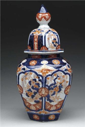 OUTSTANDING JAPANESE IMARI COVERED TEMPLE JAR. Hexagonal polychrome paneled jar in wonderful colors of cobalt blue and rust. SIZE: 15” h. CONDITION: Very good. 9-26848