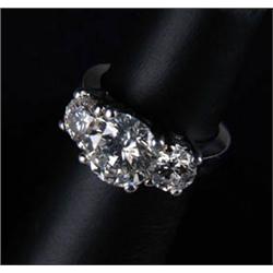 Lot 118 OUTSTANDING LADY’S DIAMOND AND PLATINUM RING One round brilliant cut diamond set in an eternity style heavy platinum band. The center diamond 3.41ct clarity SI2, color E) flanked by two other brilliant cut diamonds, one is .80 VS-2 E, the other is a .91 VS-1, D for a total diamond weight of 5.12ct. Band marked “Plat”. TW is 12.7 grams. Ring size is 6-1/4. CONDITION: Very good. 5-70835